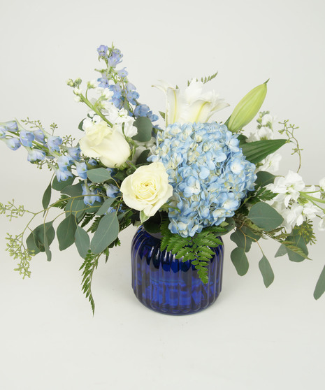 ROSES, HYDRANGEA, LILY, DELPHINIUM, STOCK WITH FRESH GREENS IN A COLORED GLASS VASE