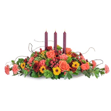 Celebrate the bountiful fall season with this breathtaking beauty of roses, carnations, berries and mums artfully arranged in this long low centerpiece. Orange roses and carnations, rust and deep yellow mums and fall color leaves – accented with willow and berries - surround a trio of taper candles in this centerpiece.