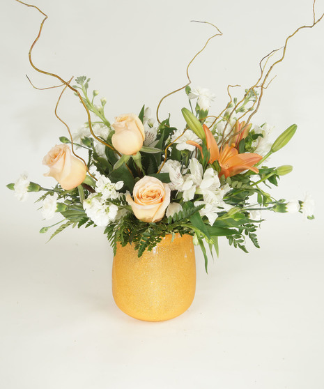 ROSES, ALSTROMARIA, CARNATIONS, LILY, STOCK AND CURLY WILLOW ACCENTED WITH FRESH GREENS IN A COLORED GLASS VASE