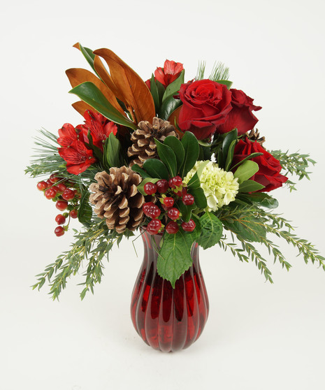 ROSES, ALSTROMARIA, HYDRANGEA, HYPERCIUM BERRY, MAGNOLIA AND PINECONES ACCENTED BY FRESH CHRISTMAS GREENS IN A COLORED GLASS VASE