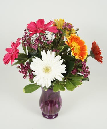 Gerbera daisies, who doesn't love gerbera daisies. assorted gerbera daisies accent by wax flower and lush green in a glass purple vase.