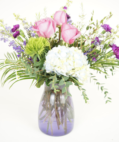 HYDRANGEA, LARKSPUR, DIANTHUS, ROSES, AND CARNATIONS ACCENTED BY FRESH GREENS IN A COLORED GLASS VASE