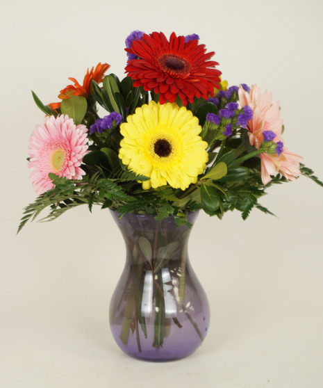 GERBERA DAISIES AND STATICE WITH FRESH GREENS IN A COLORED GLASS VASE