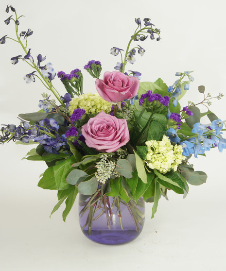 DELPHINIUM, ROSES HYDRANGEAS AND STATICE ACCENTED BY FRESH GREENS IN A COLORED GLASS VASE