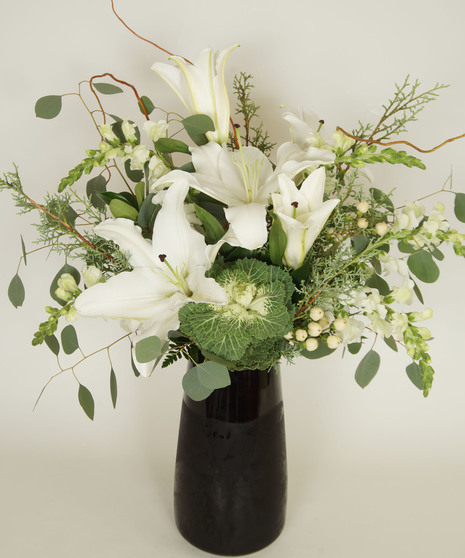LILIES, HYPERCIUM BERRY, SNAPDRAGONS, KALE, AND CURLY WILLOW ACCENTED BY FRESH CHRISTMAS GREENS IN A COLORED GLASS VASE