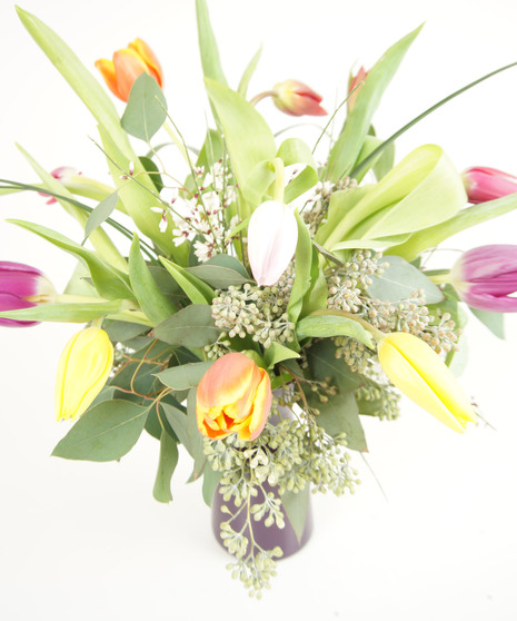 ASSORTED TULIPS WITH A TOUCH OF GINESTRA AND FRESH GREENS IN A COLORED VASE