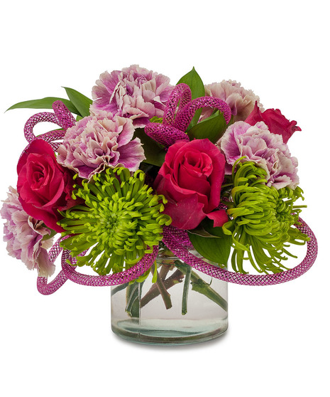 Green spider mums, hot pink roses and vintage carnations accented with a touch of hot pink fun.