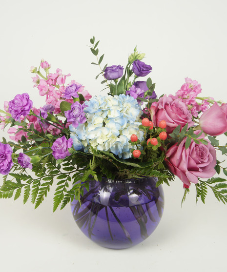 ROSES, CARNATIONS, STOCK, LISIANTHUS AND HYPERCIUM BERRY ACCENTED WITH FRESH GREENS IN A COLORED GLASS VASE
