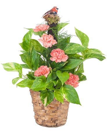 6" Green plant growing up the pole with fresh flowers and a bird perched on top. Preimum will be an 8" plant.